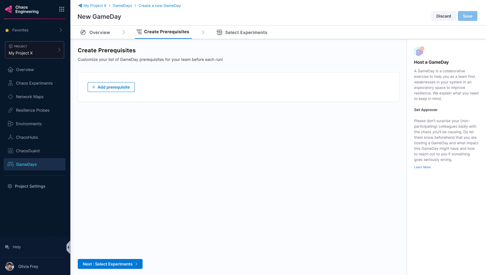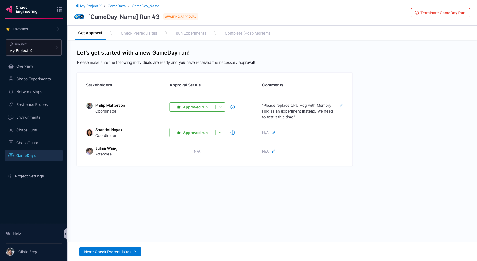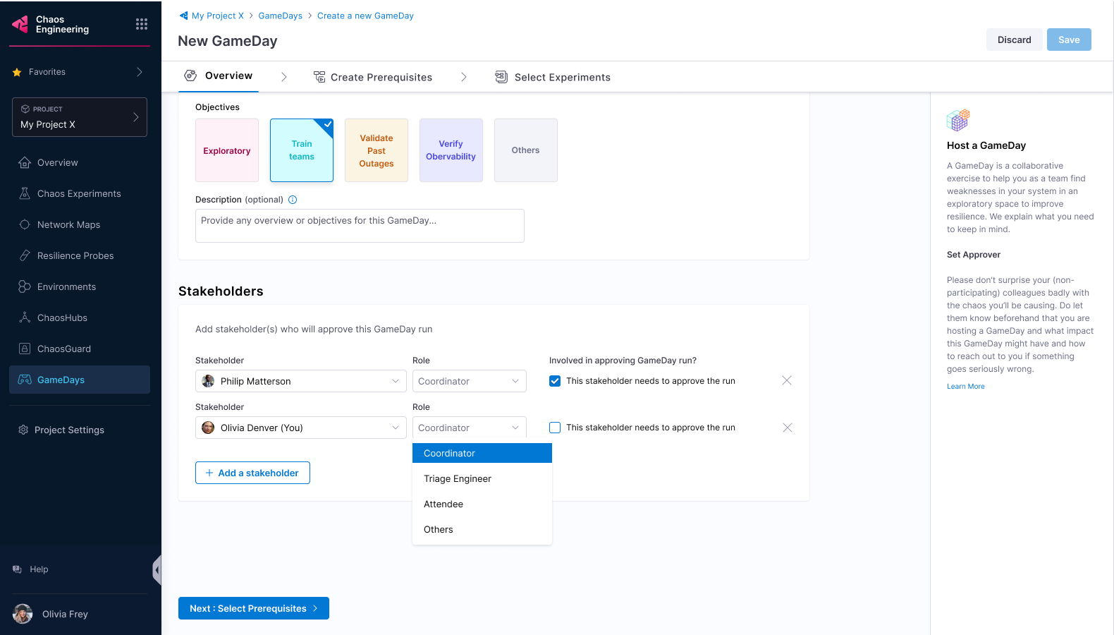 2. Add stakeholder names, their roles, and whether they are required to approve a GameDay run. Anyone can approve or reject a GameDay run. Select Next: Select Prerequisites.