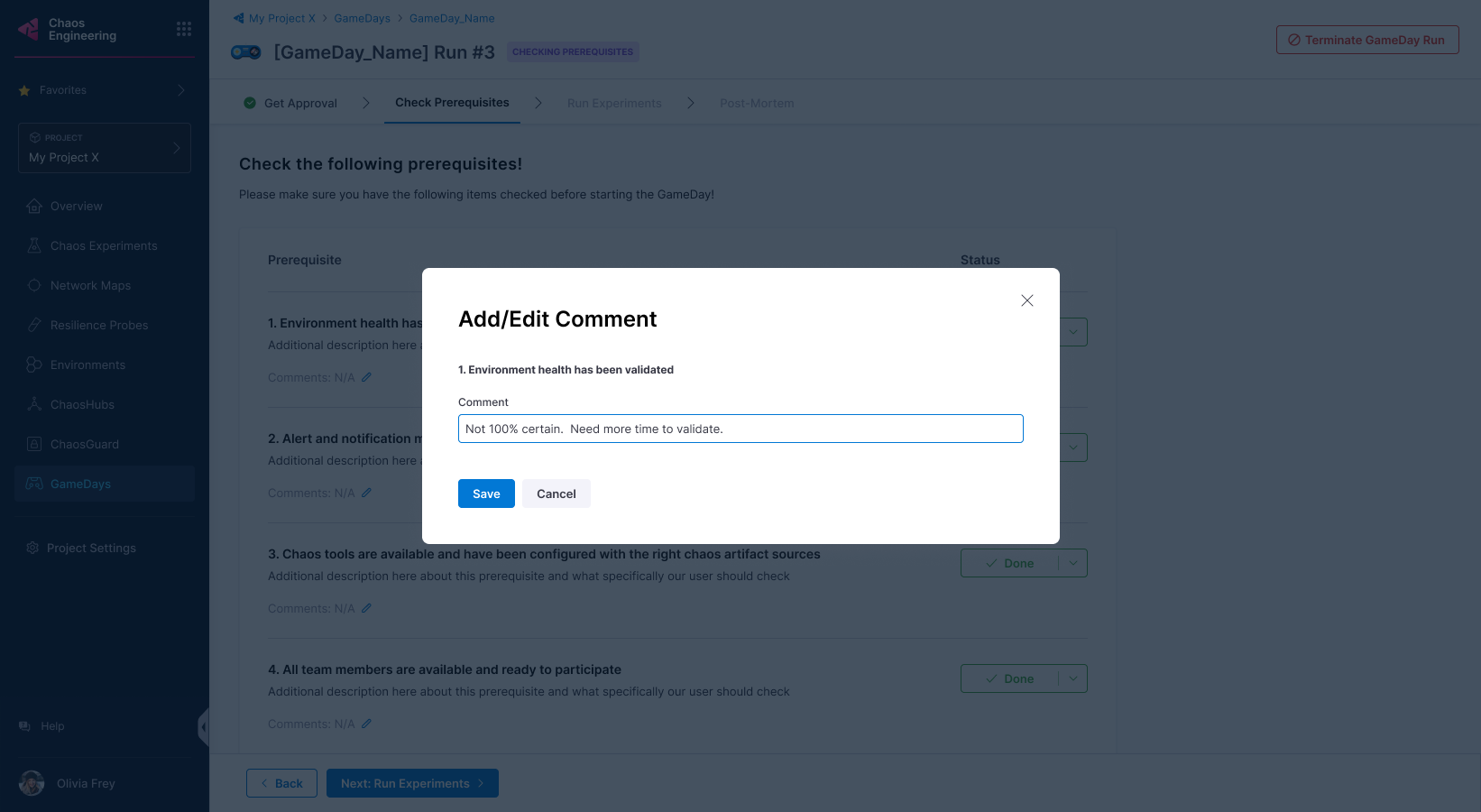 3. Add experiments to the GameDay and save it