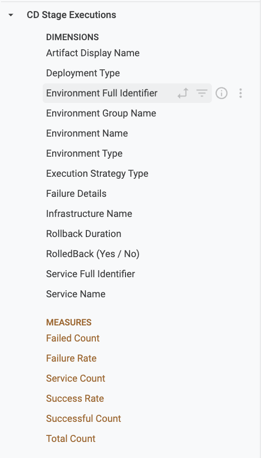 When you select CD-specific fields (for example, from CD Stage Execution Helm Manifest Info, CD Stage Executions, Environments, or Services views), the data displayed will only include CD stage–related executions.