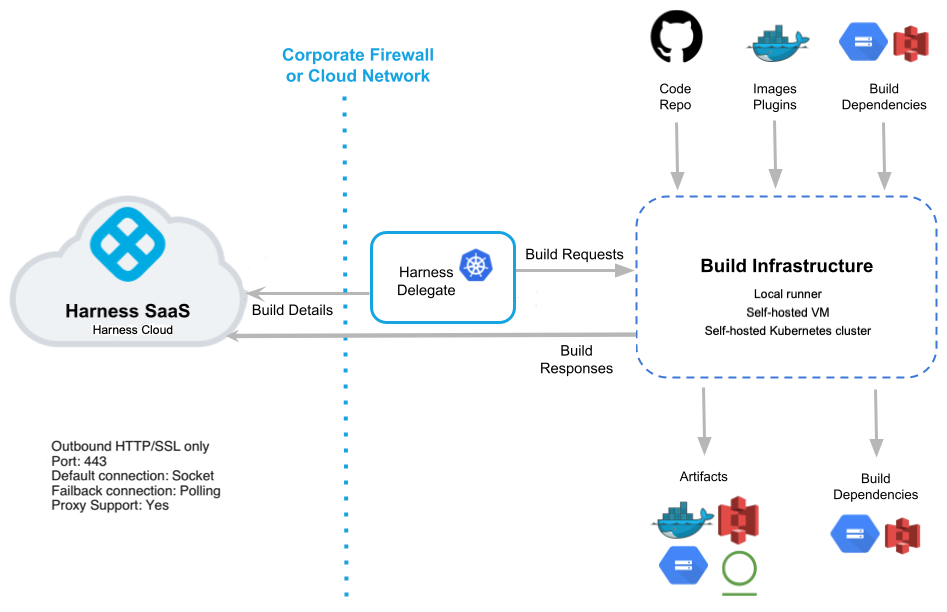Through a designated delegate or the Harness Platform, your build infrastructure integrates with your repos, registries, cloud providers, and other services.