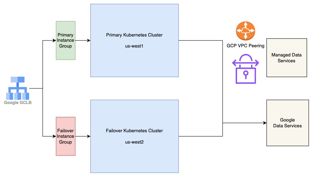 Both clusters connect to GCP managed data services for persistent storage and other data services. Additionally, they connect to a few non-GCP managed data services, such as MongoDB Atlas and Managed Timescale DB, which are VPC-peered with the GCP project to minimize network latency and enhanced security.