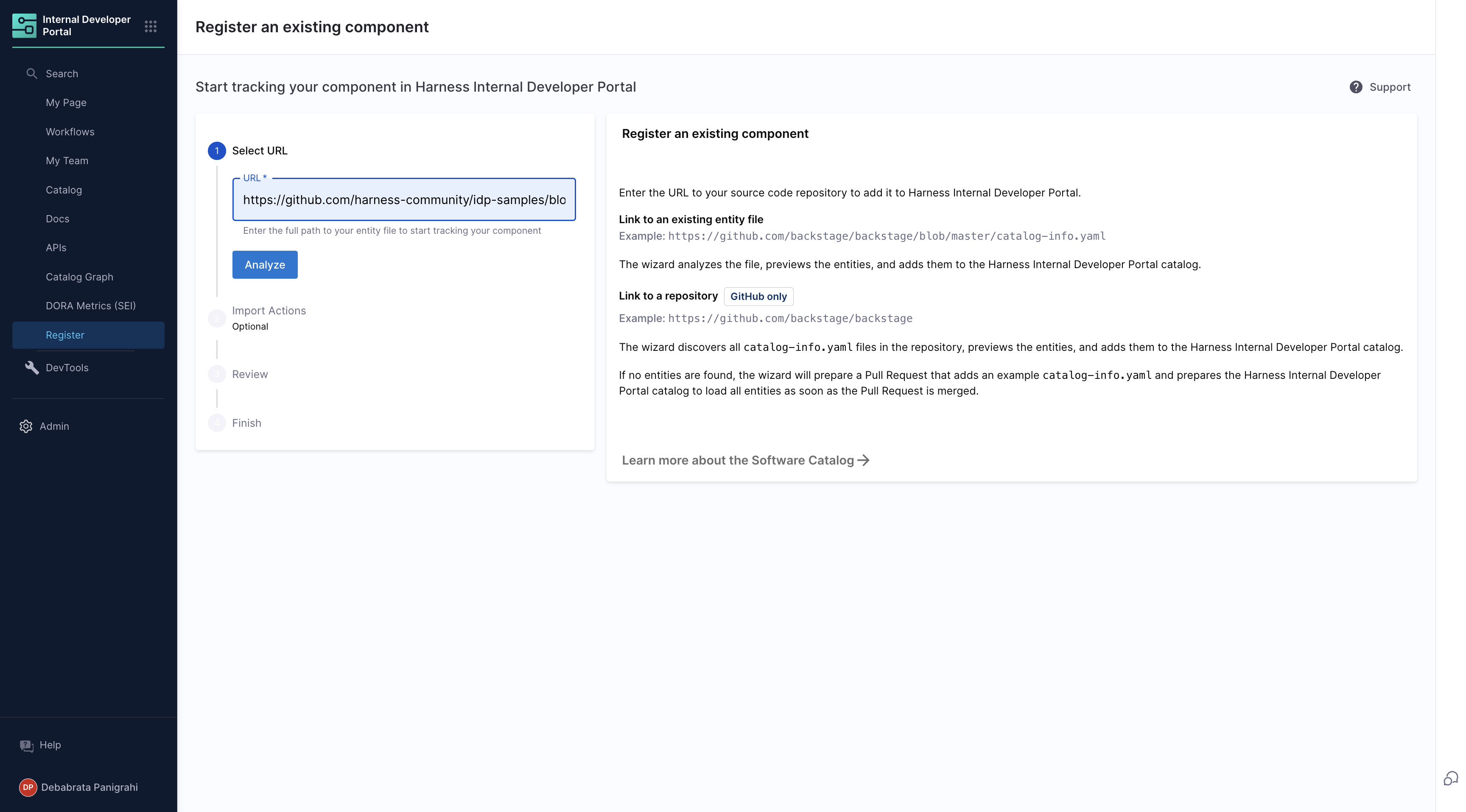 • Create a Workflow via the Harness IDP UI: Use the Harness UI to create Workflows directly—no YAML required. This method offers a streamlined, code-free experience for adding entities.