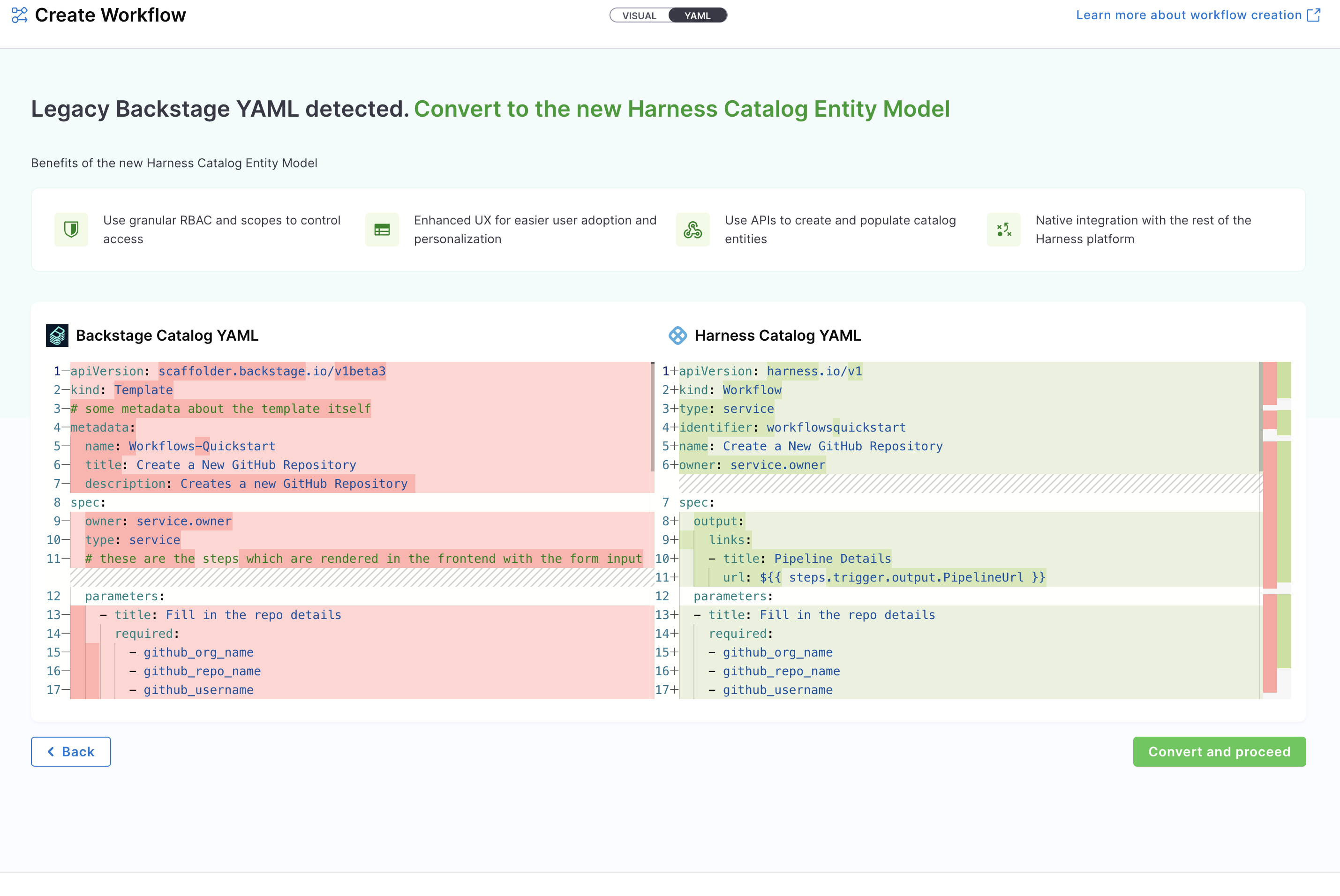 • Create a Workflow using your Workflow YAML: You can still create Workflows using your existing Workflow YAML files. Harness will automatically convert legacy Backstage YAML into the new Harness-native Data Model and register the corresponding Workflow.