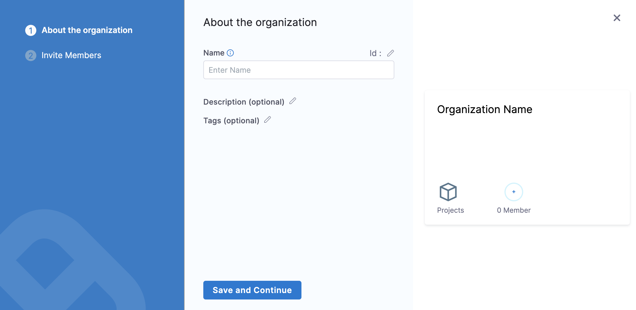 4. Enter Description, and Tags for your new org.