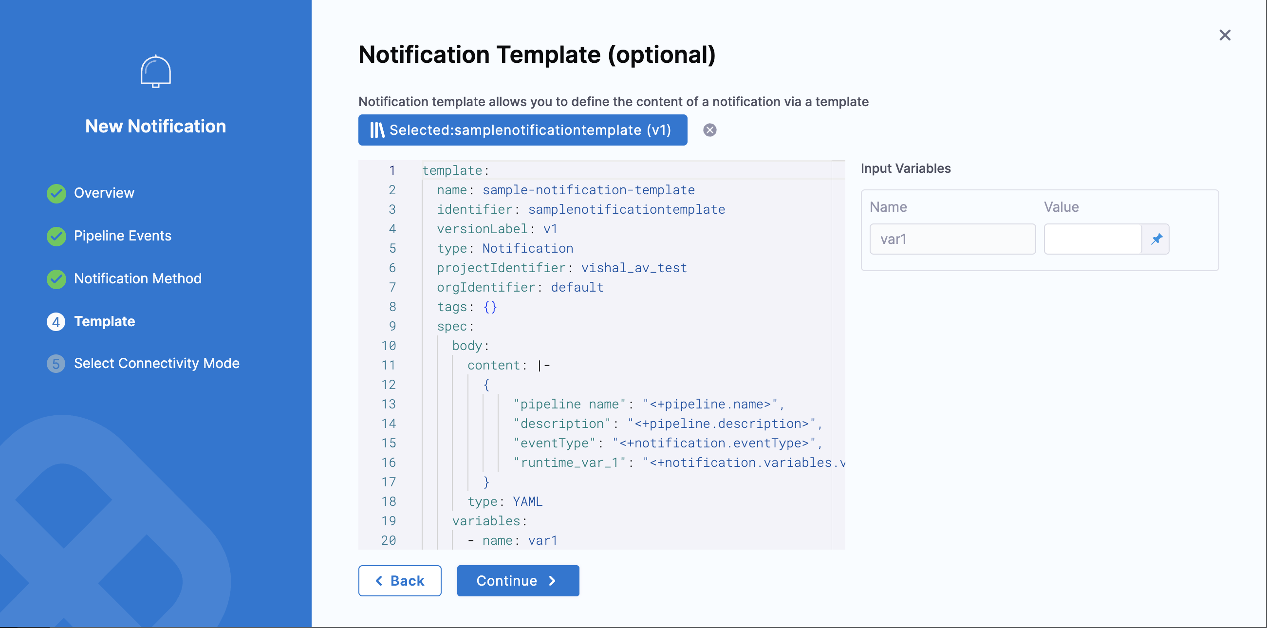 This enhanced flow is available behind the feature flag PIPE_NOTIFICATION_TEMPLATE_INPUT_VARIABLE_PROMPT_UI. Contact Harness Support to enable it.